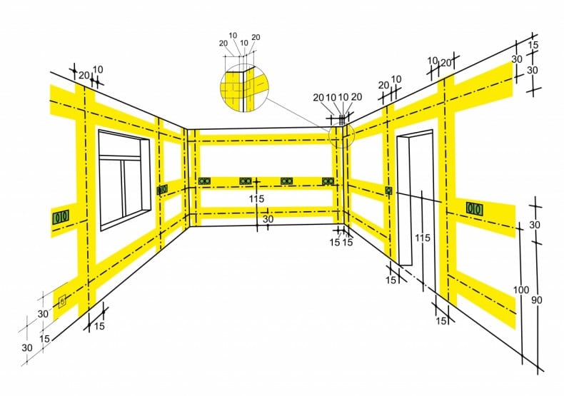 W pomieszczeniach mieszkalnych przewody są prowadzone w rurkach, kanałach, listwach instalacyjnych lub najczęściej podtynkowo. Dopuszcza się również układanie instalacji wtynkowo, jednak pod warunkiem przykrycia jej warstwą tynku o grubości co najmniej 5 mm.